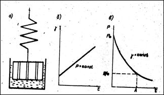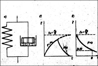 Величина λ представляет собой время, в течение которого начальное напряжение Р0 в теле уменьшается в е раз. Чем больше λ, тем медленнее релаксирует напряжение в теле. Полное рассасывание напряжений может произойти при τ = ∞. Модель Максвелла представляет собой упруго-вязкую жидкость, которая может течь (релаксировать) под действием любых нагрузок. Для нее характерна необратимость деформаций. Уравнение (21) показывает, что различие между жидкостями и твердыми телами носит кинетический (реласационный) характер. Если, например, время релаксации значительно больше времени действия напряжения (λ>>τ), то тело называется твердым. Если же время релаксации мало по сравнению с временем действия напряжения (λ<<τ), то тело ведет себя, как жидкость – напряжения уменьшаются благодаря ее течению. Отсюда следует, что поведение тела определяется временем действия напряжения по отношению ко времени релаксации. Моделью вязко-упругого твердого тела, способного восстанавливать свои свойства после снятия нагрузки (эластичность), является модель Кельвина-Фойгта (рис. 6.8).