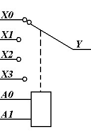 Мультиплексор – это цифровой многопозиционный переключатель, имеющий несколько сигнальных входов Xn-X0 и один выход Y. Для управления положением переключателя имеется несколько адресных входов Am-A0. Эквивалентная схема мультиплексора на 4 канала представлена на рисунке__. Подавая двоичный код на адресные входы, можно выбрать номер сигнального входа, который подключается к выходу. Схему мультиплексора на 4 канала c использованием логических элементов представлена на рисунке __.