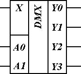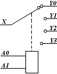 Демультиплексор – это цифровой многопозиционный переключатель, имеющий один сигнальный вход X и несколько сигнальных выходов Y0-Yn. Для управления положением переключателя имеется несколько адресных входов Am-A0. Эквивалентная схема демультиплексора на 4 канала представлена на рисунке__. Принципиальная электрическая схема демультиплексора на 4 канала и его условно графическое обозначение представлены на рисунке___. Двоичная последовательность передается с сигнального входа на сигнальный выход, соответствующий номеру на адресном входе.