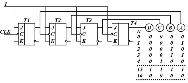 Счётчик - устройство, на выходах которого получается двоичный (двоично-десятичный) код, определяемый числом поступивших импульсов. Счётчики могут строиться на T -триггерах. Основной параметр счётчика - модуль счёта - максимальное число импульсов, которое может быть сосчитано счётчиком. Как правило, модулем счета является степень двойки: 2n, где n - число разрядов счетчика. Счётчики обозначают через СТ (от англ. counter).