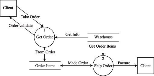 На этом рисунке сущность Клиент (Client) продублирована: клиент делает заказ и получает его. На диаграмме показано два хранилища данных, два процесса и потоки данных между клиентом, процессами и хранилищами данных. Диаграмма потока данных позволяет: