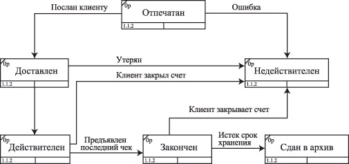 Модель жизненного цикла (ЖЦ) сущности предназначена для описания изменения состояний сущности и переходов между ними. Модель ЖЦ сущности представляется в виде диаграммы ЖЦ сущности (Entity Lifecycle Diagram), на которой изображаются пути перехода сущности из некоторого начального состояния в конечное состояние и события, инициирующие изменения состояния сущности. Модель ЖЦ сущности может быть также представлена в виде текстового описания. Для проектировщика баз данных особенно важны диаграммы ЖЦ тех сущностей, которые многократно меняют свое состояние. Обычно такая сущность имеет атрибут Status (Состояние), характеризующий состояние сущности в текущий момент времени; домен этого атрибута является некоторым множеством значений, задаваемым перечислением. Проектировщику баз данных на стадии создания физической модели базы данных потребуется знание диаграмм ЖЦ сущностей для того, чтобы прописать ограничения на реализацию атрибута Status (Состояние) в базе данных. На рис. 2.13 приведен пример диаграммы жизненного цикла сущности Чек.