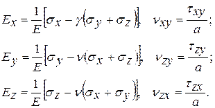 Связь между деформациями при нормальных и касательных напряжениях в породе, находящейся в объемном напряженном состоянии, выражается обобщенным законом Гука.