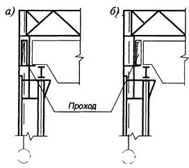 Рис. 9.8. Схемы колонн при наличии проходов: а —ступенчатые колонны с проходом внутри надкрановой части, б —то же, с проходом сбоку. Верхнюю (надкрановую) часть колонны проектируют сплошностенчатой из прокатного или сварного двутавра, нижнюю (подкрановую) при hn < 1 м сплошностенчатой, при hn >1,2 м — решетчатой.