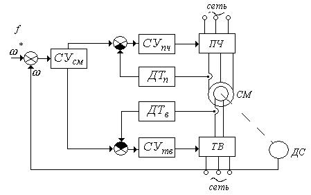 Условные обозначения. ПЧ – преобразователь частоты; ДТП – датчик тока преобразователя; СУПЧ – система управления ПЧ; ТВ – тиристорный возбудитель; СУТВ – система управления ТВ; ДТВ – датчик тока возбудителя.