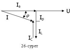 IC=U ωC – токтардың модульдері, ал U=Um/ мұндағы Токтар үшбұрышынан тізбектегі кернеудің U толық токтан I фаза бойынша қаншалықты ығысқандығын табуға болады: Егер толық ток I және φ белгілі болса, онда Ia= Icosφ, Ip= Isinφ.