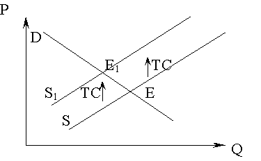 Роль институтов в рыночной экономике заключается в снижении трансакционных издержек. Минимизация трансакционных издержек ведет к повышению степени конкурентности рыночной структуры и, следовательно, в большинстве случаев к росту эффективности функционирования рыночного механизма. Наличие институциональных барьеров на пути конкуренции хозяйствующих субъектов ведёт к противоположному результату. Поэтому их исследование предполагает чёткую содержательную характеристику категории «конкуренция». Как показали Д. Норт и Дж. Уоллис, развитие рыночных отношений в переходной экономике обусловливает возникновение и развитие трансакционного сектора[42][16]. Согласно их трактовке, к трансакционному сектору относятся отрасли, основная функция которых заключается в обеспечении перераспределения ресурсов и продукции с наименьшими средними трансакционными издержками. В развитых странах наблюдается тенденция снижения удельных трансакционных издержек, что детерминирует увеличение количества сделок, и поэтому объём совокупных издержек в экономике может расти[43][17]. Однако в России вследствие существования неэффективных институтов, административных барьеров и ограничений средние трансакционные издержки остаются на недопустимо высоком уровне, что ограничивает объём и количество сделок, приводит к увеличению предельных издержек предприятий, подвергающихся их воздействию. Таким образом, воздействие растущих трансакционных издержек на рыночное равновесие осуществляется по механизму введения дополнительных налогов. Как видно из рисунка 1, на рынке отдельного товара это ведёт к росту цены и снижению объёмов продаж. Это положение модели согласуется с реалиями хозяйственной практики России, где наблюдаются относительно высокие цены по сравнению с доходами населения.