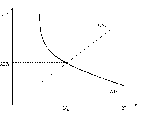 Рисунок 1. Смещение равновесия под действием роста трансакционных издержек Смещение кривой предложения будет тем сильнее, чем выше уровень трансакционных издержек TC. Использование трансакционных издержек как инструмента экономического анализа даёт возможности для интерпретации институционального равновесия и его модификации в переходной экономике[44][18]. Спрос на институты предъявляют индивиды, группы или общество в целом, так как общественные или групповые затраты по созданию и существованию института должны быть меньше затрат, возникающих при его отсутствии. Величина трансакционных издержек становится не только количественным показателем степени несовершенства рынков, но и количественным выражением издержек отсутствия института[45][19]. Поэтому, чем выше величина трансакционных издержек, тем выше спрос на институциональное регулирование, которое дополняет и даже заменяет рыночное. Согласно современной институциональной теории, эффективность функционирования того или иного института определяется величиной экономии на трансакционных издержках. Поэтому расходы по инженерии обществом институтов на рынке труда будут соотноситься с величиной трансакционных издержек (ATС), что позволяет выразить через них функцию спроса на институты, и издержками коллективного действия (CAC), которые характеризуют предложение институтов «на институциональном рынке» [46][20]. Процесс установления институционального равновесия представлен на рисунке 2 (N – число включенных в сферу действия институтов индивидов, AIC – институциональные издержки – трансакционные, снижение которых обеспечивают институты, и издержки по созданию институтов).