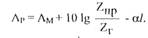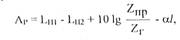 Если мощности Р1 и Р2 выразить через напряжения и сопротивления, то формула рабочего затухания цепи примет вид: