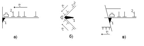 Рисунок 3.13 – Дислокационные модели зарождения микротрещин: а – модель Зинера – Стро; б – модель Коттрела; в – модель встречных скоплений; 1 – трещина; 2 – дислокация. В общем случае, в зависимости от условий нагружения и исходногосостояния материала, можно выделить несколько механизмов роста микротрещин: а) хрупкий – путём разъединения атомных плоскостей в вершиш трещины; б) пластический – в результате коррелированного поглощение щслокацийразных систем скольжения; в) вязкий – благодаря поглощению микроскопических пор. Механизм распространения трещин предопределяет вид излома.