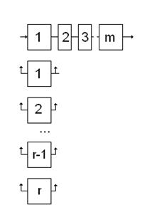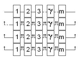 Вероятность безотказной работы, эффективность, среднее время безотказной работы, среднее время ремонта, т.е. надёжность аппаратов, машин, технологических линий в химической промышленности могут быть улучшены путём повышения: - надёжности за счёт применения более надёжных выпускаемых серийно деталей и узлов, контроля их качества, выбора оптимальных режимов, увеличения заноса прочности узлов и деталей и т.д. - конструктивной надёжности за счёт совершенствования кинематических схем аппаратов, использования оптимальных конструктивных решений, применения стандартизованных и унифицированных узлов и деталей надёжной сборки, защиты от коррозии и т.д. - эксплуатационной надёжности путём разработки рациональных способов и условий хранения оборудования до его эксплуатации, разработки конструкций по монтажу, эксплуатации, ремонту машин и аппаратов, проведения предварительных испытаний и др. Резервирование узлов в аппаратах, самих аппаратов, технологических линий в химических производствах является способом повышения надёжности за счёт включения резерва. Этот способ повышения надёжности позволяет создавать систему аппаратов, надёжность которой выше надёжности входящих составляющих. Практика ограничивает возможности применения резервирования, так как оно связано с увеличением веса, производственной площади, повышением стоимости и т.д. Существует основное, резервное и смешанное соединение аппаратов. Основным соединением аппаратов называется такое соединение, при котором отказ хотя бы одного аппарата ведёт к отказу всего соединения. Так, например, в производстве силикатного кирпича имеется основное соединение аппаратов. Другим примером основного соединения аппаратов является технологическая схема синтеза аммиака из водорода и азота. В систему входят компрессор высокого давления, контактные аппараты, холодильники - конденсаторы аммиака. Основные соединения аппаратов применяются в том случае, когда в системе нет резервных аппаратов. При включении в систему резервных аппаратов создаётся резервное соединение аппаратов, при котором отказ соединения наступает только после отказа основного и всех резервных аппаратов. В смешанном соединение сочетаются основное и резервное соединение. Различают два принципиально различных метода повышения надёжности путём резервирования: общее резервирование, при котором резервируется аппарат в целом (рисунок 4.3.) и раздельное (поэлементное) резервирование, при котором резервируются отдельные узлы аппарата (рисунок 4.4). При раздельном резервировании обеспечивается больший выигрыш в надёжности, чем при общем резервировании. Раздельное резервирование выгодно при большом числе элементов (м) и увеличении кратности резервирования. Под кратностью резервирования будем понимать отношение числа резервных аппаратов к числу резервируемых. Различают резевирование с целой кратностью называется такое резервирование, при котором для нормальной работы резервного соединения достаточного чтобы исправным был хотя бы один аппарат. Иными словами, если в основным аппаратом закреплены один или несколько резервных, то такое резервирование будет резервированием с целой кратностью, т.е. кратность резервирования выражается целым числом. При резервировании с дробной кратностью определённое чи