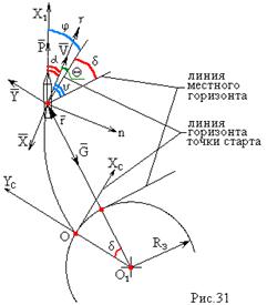 δ – полярный угол, характеризует наклонение плоскости местного горизонта к плоскости точки старта.