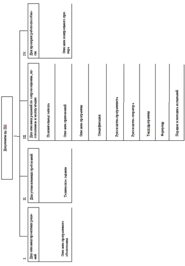 Требования к содержанию документов с решениями по Состав документов по программному обеспечению АС определяют ГОСТ 34.201-89 (Виды, комплектность и обозначение документов при создании автоматизированных систем) и ГОСТ 19.101-77, регламентирующий виды документов на программные средства, используемые при создании АС. Документы по программному обеспечению АС можно разделить на четыре группы: 1) для описания проектных решений по программному обеспечению; 2) для установления требований к программе или комплексу программ; 3) для описания решений, обеспечивающих сопровождение, изготовление и эксплуатацию программы или комплекса программ; 4) для проверки работоспособности программы или комплекса программ (см. рис/ 4.1). I. К первой группе относится документ «Описание программного обеспечения». Этот документ, согласно ГОСТ 34.201-89, разрабатывается на стадии «Технический проект». Его состав определен РД 50-34.698-90. Документ состоит из следующих шести разделов: 1. «Вводная часть», где содержатся основные сведения об АС, необходимые для разработки программного обеспечения; 2. «Структура программного обеспечения», где приводится перечень частей программного обеспечения с указанием взаимосвязей и обоснованием выделения каждой из них; 3. «Функции частей программного обеспечения», этот раздел состоит из подразделов, в каждом из которых приводится назначение и описание основных функций соответствующей части; 4. «Методы и средства разработки программного обеспечения», где дается перечень методов программирования и средств разработки программного обеспечения АС с указанием частей программного обеспечения, при разработке которых использовались эти методы и средства; 5. «Операционная система», где дается обоснование выбранной операционной системы, наименование руководства, в соответствии с которым должна осуществляться генерация выбранного варианта операционной системы; требования к варианту генерации выбранной версии операционной системы; 6. «Средства, расширяющие возможности операционной системы», этот раздел состоит из подразделов, в которых, для каждого используемого средства, расширяющего возможности операционной системы, указывается: наименование, обозначение и краткая характеристика средства с обоснованием необходимости его применения и указанием источника, где дано подробное описание выбранного средства; наименование руководства, в соответствии с которым следует настраивать используемое средство на конкретное применение; требования к настройке используемого средства. II. Вторая группа состоит из одного документа, определяющего требования к программе или комплексу программ, - «Техническое задание». Этот документ составляют в соответствии с ГОСТ 19.201-78 (ЕСПД. Техническое задание. Требования к содержанию и оформлению). «Техническое задание» содержит следующие разделы: 1) введение; 2) основание для разработки; 3) назначение разработки; 4) требования к программной документации; 5) технико-экономические показатели; 6) стадии и этапы разработки; 7) порядок контроля и приемки. Допускается вводить новые разделы или объединять отдельные из них. Наиболее важным в этом документе является раздел, касающийся требований к программе. Этот раздел должен включать следующие подразделы: 1) требования к функциональным характеристикам (т.е. требова