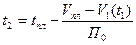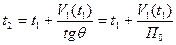 Приняв t1 за точку первого опроса, можно получить сведения о фактическом объеме выполненной работы V1(t1). Этот объем по смыслу должен быть отличен от нуля и, более того, можно утверждать, что точка А1(t1) лежит между прямыми, соответствующими ходу работ с минимальной и максимальной скоростями выполнения. Проведя через точку с координатами (V1(t1), t1) прямую, параллельную оси абсцисс и соответствующую нулевой скорости выполнения работы до пересечения с прямой, параллельной прямой V0(t), получим точку t2, определяемую из следующих равенств: