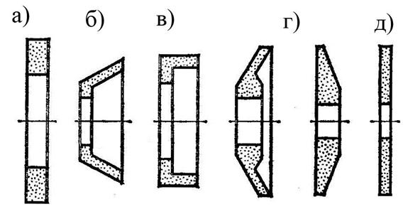 Рис. 12.2. Типы шлифовальных кругов: а) плоские; б) чашечные конические; в) чашечные цилиндрические; г) тарельчатые; д) дисковые - плоские; - чашечные конические; - чашечные цилиндрические; - тарельчатые; - дисковые. Для шлифования резьб используются специальные профильные круги. Шлифовальные круги подвергают правке (очистке от засаливания и зату-пившихся зерен) с помощью специальных алмазных карандашей и шарошек.