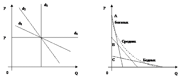 Предположим, что изменяется значение одного из неценовых детерминантов спроса, например, дохода населения. Если доход увеличивается, то каждой возможной цене товара будет соответствовать большой объем спроса (мы предполагаем, что вкусы, привычки населения не изменились). Следовательно, произойдет сдвиг линии спроса вправо из положения dd в положение dd (рис. 5.3.). Напротив, уменьшение дохода приведет к смешению линии спроса влево в положение d2d2. В этом случае говорят об изменении "самого спроса". Следовательно, следует четко различать объем спроса и самого спроса. Термин "изменение самого спроса" связывается с изменением положения линии спроса вправо или влево, в то время как термин "изменение объема спроса" относится к какой-либо отдельной точке, скользящей по линии спроса. Индивидуальный и групповой спрос. До сих пор мы говорили об общественном спросе, который формируется из индивидуальных и групповых спросов. Индивидуальный спрос колеблется в большом диапазоне, другими словами, он связан с множеством факторов, таких как уровень дохода, вкус, пол и возраст, уровень образования, национальные традиции. Как показывает рис. 5.5., диапазон колебания индивидуальных спросов происходить от горизонтальной линии d4 до вертикальной линии d3. Горизонтальная линия d4 означает, что некоторые индивидуумы покупают данный товар только в пределах цены Р, но не выше; вертикальная – d3 – при любой цене в пределах Р. Однако рыночная цена не может подняться выше так называемой максимальной цены спроса, по которой субъект согласен приобрести данное количество товара в единицу времени. Кривая d показывает более сильную зависимость спроса от цены, чем кривая d2. Отсюда заключаем, что чем больше угол наклона кривой спроса к оси цен Р, тем больше его зависимость от цен.