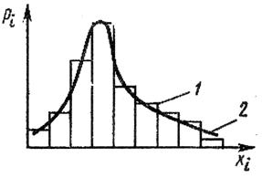 Рис. Общий вид распределения случайных величин: 1 – гистограмма; 2 – кривая распределения