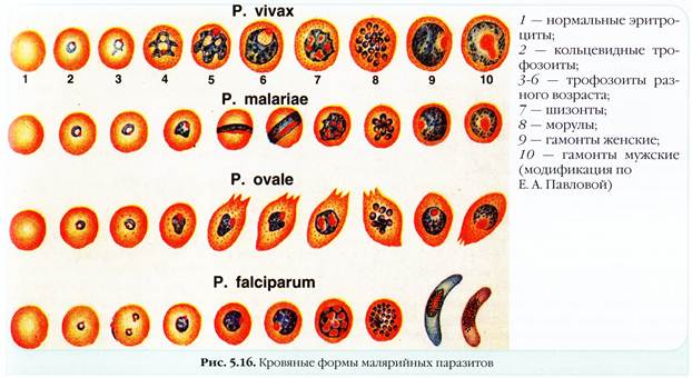 Возбудителями малярии у человека являются 4 вида плазмодиев: 1. Возбудитель 3-х дневной малярии (plasmodium vivax) - в эритроците больного при окраске мазка из крови по Романовскому имеет форму правильного кольца: в центре вакуоль окружена голубой цитоплазмой с рубиново-красным ядром (кольцевидный трофозоит). 2. Возбудитель 4-х дневной малярии (plasmodium malariae) - полувзрослый трофозоит внутри эритроцита имеет лентовидную форму. 3. Возбудитель тропической малярии (plasmodium falciparum) - для него характерны юные формы в виде мелких колец в эритроците. 4. Возбудитель малярии, типа 3-х дневной – овале (plasmodium ovale) - в эритроците имеет крупное ядро. Появляется зернистость, часть эритроцитов имеет овальную форму.