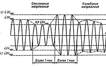 Рисунок 10.1. Кривые отклонения и колебания напряжения 2, 3. Размах изменения напряжения и доза фликера характеризуют колебания напряжения (причина – потребители с резко переменной нагрузкой). Колебание напряжения отрицательно влияет на работу осветительных установок. Размах изменения напряжения определяется формулой: