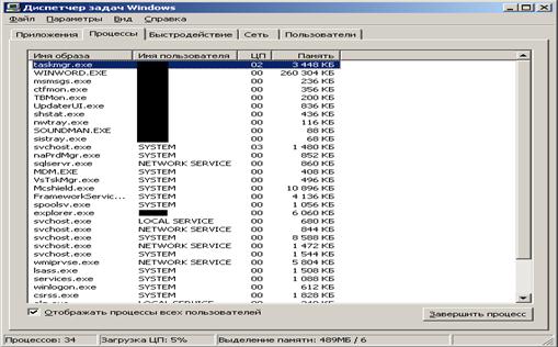 Процесс самостоятельно не переходит из одного состояния в другое. Изменением состояния процессов занимается операционная система. Операции над процессами производимые операционной системой удобно объединить в пары: - создание процесса – завершение процесса; - приостановка процесса – запуск процесса; - блокирование процесса – разблокирование процесса; - изменение приоритета процесса. Операции создание и завершение процесса являются одноразовыми, так как применяются к процессу не более одного раза (некоторые системные процессы при работе вычислительной системы не завершаются никогда). Остальные операции, связанные с изменением состояния процессов, являются многоразовыми. Одноразовые операции приводят к изменению количества процессов, находящихся под управлением операционной системы и всегда связаны с выделением или освобождением определенных ресурсов. Многоразовые операции не приводят к изменению количества процессов и не обязаны быть связанными с выделением или освобождением ресурсов. Одноразовая операция создание процесса. Сложный жизненный путь процесса начинается с его рождения. В простых системах все процессы могут порождаться на этапе старта системы, в более сложных системах – создаваться динамически по мере необходимости. Инициатором рождения процесса после старта операционной системы может быть процесс пользователя, совершивший специальный системный вызов, либо процесс созданный самой операционной системой. Процесс, создавший новый процесс, называют процессом родителем, а созданный процесс – потомком (дочерним процессом или ребенком). Выделяют четыре основных события, которые приводят к созданию новых процессов: - загрузка (инициализация) системы; - выполнение изданного работающим процессом системного запроса на создание процесса; - запрос пользователя на создание процесса; - инициирование пакетного задания. При загрузке операционной системы создаются несколько процессов, одни – высокоприоритетные, обеспечивающие взаимодействие с пользователем и выполняющие заданную работу, другие – фоновые, выполняющие особые функции. Например, один фоновый процесс обрабатывает приходящую электронную почту, активизируясь только при появлении писем, другой – обрабатывает запросы к web -страницам, активизируясь для обслуживания полученного запроса. Фоновые процессы, связанные с электронной почтой, web- страницами, новостями, выводом на печать и т.п. называются демонами. В больших системах насчитываются десятки демонов. В UNIX для вывода списка запущенных процессов используется программа ps, в Windows 95/98/Ме – комбинация клавиш CTRL-ALT-DEL, в Windows 2000 – диспетчер задач (рис.3.4). Процессы могут создаваться и в процессе работы системы, например, по просьбе текущего процесса или при запуске пользователем программы. С технической точки зрения новый процесс формируется одинаково: текущий процесс выполняет системный запрос на создание нового процесса. Системный запрос заставляет операционную систему создать новый процесс и содержит информацию о программе, которую нужно запустить в этом процессе. В роли текущего процесса могут выступать: процесс, запущенный пользователем; системный процесс; процесс, инициированный клавиатурой или мышью; процесс, управляющий пакетами.