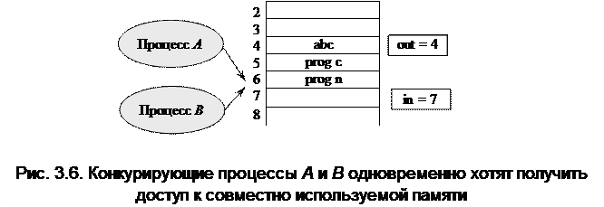 Пусть каталог спулинга состоит из сегментов, пронумерованных 0, 1, 2,..., в каждом их которых может храниться имя файла. Имеются совместно используемые переменные: out – указывающая на следующий файл для печати; in – указывающая на следующий свободный сегмент. Эти переменные можно хранить в одном файле, доступном всем процессам. Сегменты с 0 по 3 пусты, так как файлы напечатаны, в сегментах с 4 по 6 файлы ждут своей очереди на печать. Конкурирующие процессы А и В решают поставить файл в очередь на печать (рис. 3.6.). Возможна следующая ситуация. Процесс А считывает значение переменной in и сохраняет его в локальной переменной, например, next_free_slot. После этого происходит прерывание по таймеру, и процессор переключается на процесс В. Процесс В считывает значение переменной in и сохраняет его в своей локальной переменной next_free_slot. В данный момент оба процесса считают, что следующий свободный сегмент – седьмой. Процесс В сохраняет в каталоге спулинга имя файла и заменяет значение in на 8, затем продолжает заниматься другими задачами. Затем управление переходит к процессу А, который продолжает с того места, на котором остановился. Он обращается к переменной next_free_slot, считывает ее значение и записывает в седьмой сегмент свое имя файла, удаляя имя файла, записанное туда процессом В. Затем он заменяет значение in на 8 (next_free_slot +1 = 8). Структура каталога спулинга не нарушена и демон печати не заметит изменений, поэтому файл процесса В не будет напечатан. Ситуации, в которых два и более процесса считывают или записывают данные одновременно и конечный результат зависит от того, какой из них был первым, называются состояниями состязания. Основным способом предотвращения проблем, связанных с совместным использованием памяти, файлов и др., является запрет одновременной записи и чтения разделенных данных более чем одним процессом. С этой целью используется взаимное исключение – когда один процесс использует разделенные данные, другому процессу это делать запрещено. Выше описанная проблема возникла из-за того, что процесс В начал работу с одной из совместно используемых переменных до того, как процесс А ее закончил. Например, некоторый промежуток времени процесс занят внутренними расчетами и другими задачами, не приводящими к состояниям состязания. В другие моменты времени процесс обращается к совместно используемым данным или выполняет какое-то другое действие, которое может привести к состязанию. Часть программы, в которой есть обращение к совместно используемым данным, называется критической областью или критической секцией. Для исключения состязания необходимо выполнение четырех условий: - два процесса не должны одновременно находиться в критических областях; - в программе не должно быть предположений о скорости или количестве процессоров; - процесс, находящийся вне критической области, не может блокировать другие процессы; - должна отсутствовать ситуации, в которой процесс постоянно ждет попадания в критическую область. Пусть процесс А попадает в критическую область, чуть позже процесс В так же пытается попасть в критическую область, но ему это не удается, поскольку в критической области уже находится процесс А, а два процесса не должны одновременно находиться в критических областях. Поэтому процесс В временно приостанавливает свою работу до на
