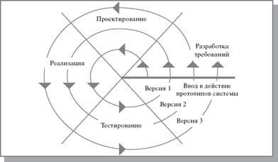 Жизненный цикл (ЖЦ) - ряд событий, происходящих с системой в процессе ее создания и использования. На каждом из этапов ЖЦ необходимо учитывать множество факторов и условий, чтобы осуществить эффективно без применения системного применения системного подхода невозможно. Сущность системного подхода состоит в учете взаимосвязей между элементами системы, между системой и внешней средой, в учёте развития подсистемы в настоящем и перспектив развития в будущем. Рассматривая работу одного элемента системы, нельзя забывать о связях, существующих между различными элементами системы, а также между системой и внешней средой. Системный подход заключается в нескольких этапов. 1. Планирование и анализ требований (предпроектная стадия) – системный анализ – исследование и анализ существующей ИС, определение требований к создаваемой ИС, оформление технико-экономического обоснования (ТЭО) и технического задания (ТЗ) на разработку ИС. 2. Проектирование – разработка в соответствии со сформулированными требованиями состава автоматизируемых функций и состава обеспечивающих подсистем. 3. Реализация – разработка и настройка программ, наполнение БД, создание рабочих инструкций, формирование рабочего проекта. 4. Внедрение – ведётся отладка систем. 5. Эксплуатация, сопровождение и модернизация – сбор статистики о функционировании ИС, исправление ошибок и недоработок, оформление требований к модернизации ИС и её выполнение. Важной чертой ЖЦ является его повторяемость. В настоящее время известны и используются следующие модели жизненного цикла: Каскадная модель (рис. 5.1) предусматривает последовательное выполнение всех этапов проекта в строго фиксированном порядке. Переход на следующий этап означает полное завершение работ на предыдущем этапе. Поэтапная модель с промежуточным контролем (рис. 5.2). Разработка ИС ведется итерациями с циклами обратной связи между этапами. Межэтапные корректировки позволяют учитывать реально существующее взаимовлияние результатов разработки на различных этапах; время жизни каждого из этапов растягивается на весь период разработки. Спиральная модель (рис. 5.3). На каждом витке спирали выполняется создание очередной версии продукта, уточняются требования проекта, определяется его качество, и планируются работы следующего витка. Особое внимание уделяется начальным этапам разработки - анализу и проектированию, где реализуемость тех или иных технических решений проверяется и обосновывается посредством создания прототипов (макетирования).