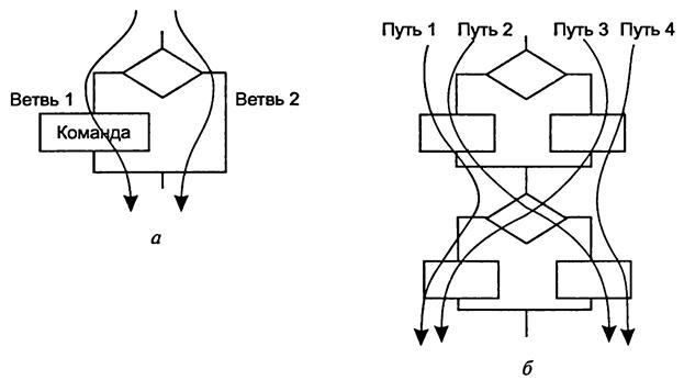 Эффективность контроля 1-го вида зависит и от языка, и от компилятора. Контроль 2-го вида осуществляется с помощью исключений — Exceptions и весьма полезен для проверки правдоподобности промежуточных результатов. Тест — это набор контрольных входных данных совместно с ожидаемыми результатами. В число входных данных время зависимых программ входят события и временные параметры. Ключевой вопрос — полнота тестирования: какое количество каких тестов гарантирует, возможно, более полную проверку программы? Исчерпывающая проверка на всем множестве входных данных недостижима. Пример: программа, вычисляющая функцию двух переменных: Y=f(X, Z). Если X, Y, Z — real, то полное число тестов (232)2 = 264«1031 Если на каждый тест тратить 1 мс, то 264 мс = 800 млн лет. Следовательно: • в любой нетривиальной программе на любой стадии ее готовности содержатся необнаруженные ошибки; • тестирование — технико-экономическая проблема, основанная на компромиссе время — полнота. Поэтому нужно стремиться к возможно меньшему количеству хороших тестов с желательными свойствами. Детективность: тест должен с большой вероятностью обнаруживать возможные ошибки Покрывающая способность: один тест должен выявлять как можно больше ошибок. Воспроизводимость: ошибка должна выявляться независимо от изменяющихся условий (например, от временных соотношений) — это труднодостижимо для времязависимых программ, результаты которых часто невоспроизводимы. Только на основании выбранного критерия можно определить тот момент времени, когда конечное множество тестов окажется достаточным для проверки программы с некоторой полнотой (степень полноты, впрочем, определяется экспериментально). Используется два вида критериев (табл. 5.2): • функциональные тесты составляются исходя из спецификации программы; • структурные тесты составляются исходя из текста программы. На рис. 5.1, а видно отличие тестирования команд (достаточен один тест) от С1 (необходимы два теста как минимум). Рисунок 5.1, б иллюстрирует различие С1 (достаточно двух тестов, покрывающих пути 1, 4 или 2, 3) от С2 (необходимо четыре теста для всех четырех путей). С2 недостижим в реальных програм мах из-за их цикличности, поэтому ограничиваются тремя путями для каждого цикла: 0, 1 и N повторений цикла. Таблица 5.2. Виды критериев и их функциональность